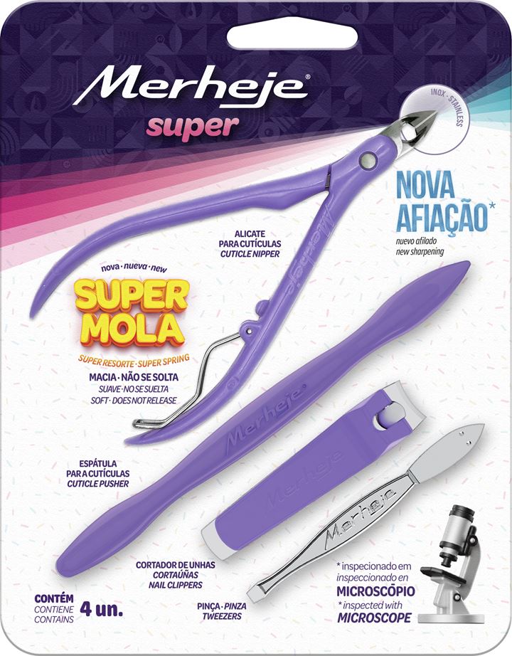 ALICATE PARA CUTICULAS + KIT UN BASIC ESPATULA, CORTADOR E PINÇA LILAS - MERHEJE