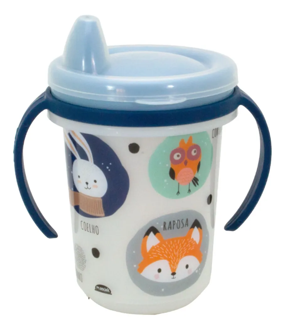 CANECA DE PLASTICO INFANTIL TRIO AZUL COM ALCA E TAMPA DECORADA 330ML - PLASUTIL