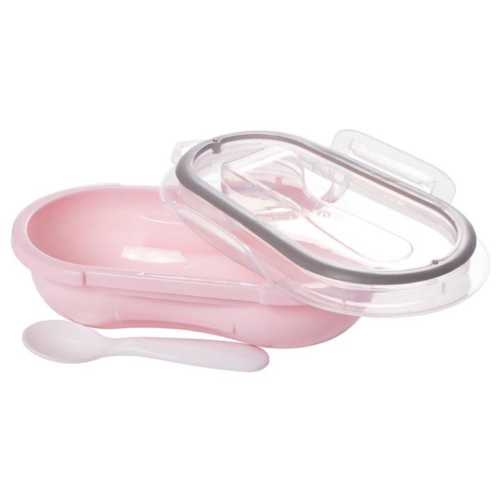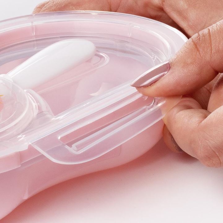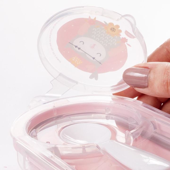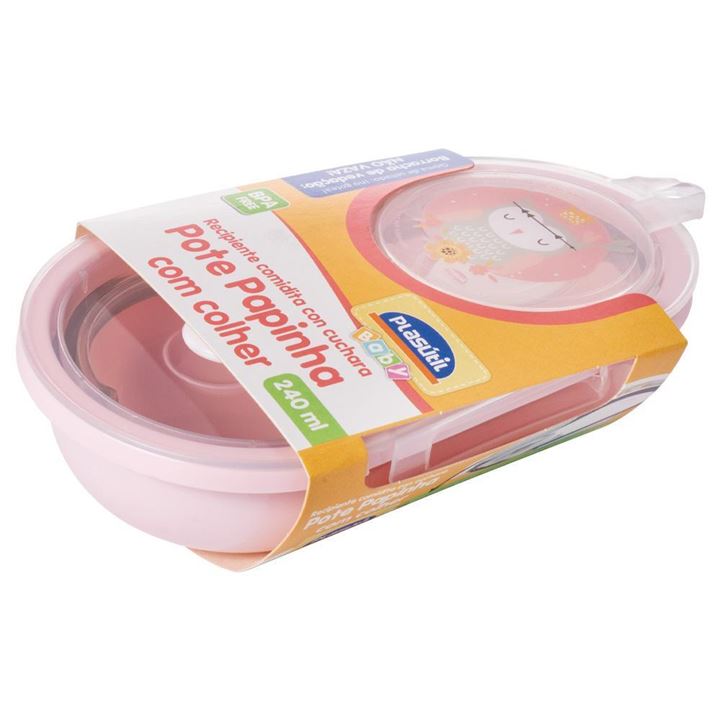 PORTA PAPINHA DE PLASTICO COM TRAVA E COLHER DECORADA ROSA INFANTIL-PLASUTIL