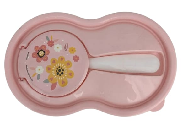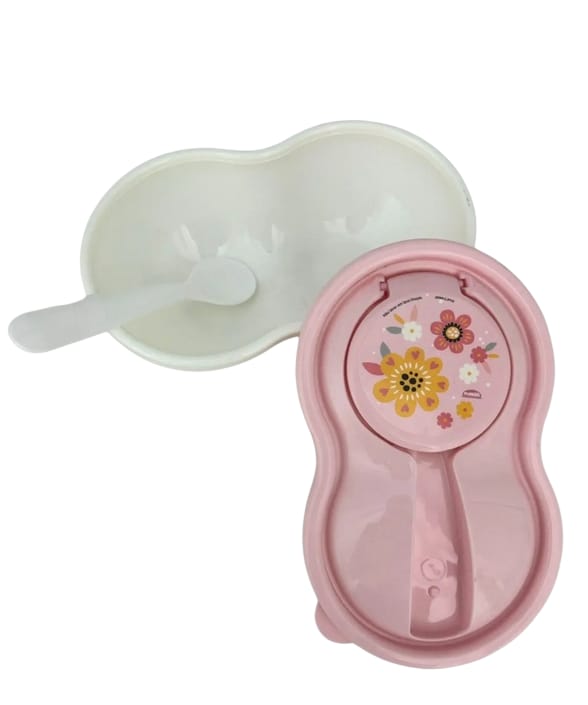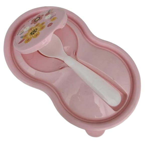 POTE DE PAPINHA PLASTICO ROSA COM COLHER DECORADA COM FLORES INFANTIL - PLASUTIL